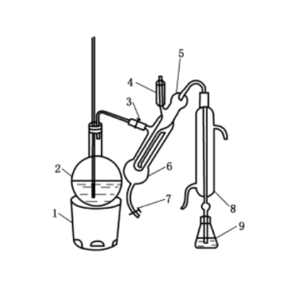 5.1.3 向接收瓶內(nèi)加入10.0 mL硼酸溶液及1滴~2滴混合指示液(B)并保持滿瓶,并使冷凝管的 下端插入液面下,根據(jù)試樣中氮含量,準(zhǔn)確吸取2.0 mL~10.0 mL試樣處理液由小玻杯注入反應(yīng)室,以10 mL水洗滌小玻杯并使之流入反應(yīng)室內(nèi),隨后塞緊棒狀玻塞。將10.0 mL氫氧化鈉溶液倒入小玻杯,提起玻塞使其緩緩流入反應(yīng)室,立即將玻塞蓋緊,并加水封。夾緊螺旋夾,開始蒸餾。蒸餾10 min 后移動蒸餾液接收瓶,液面離開冷凝管下端,再蒸餾1 min。然后用少量水沖洗冷凝管下端外部,取下蒸餾液接收瓶。以硫酸或鹽酸標(biāo)準(zhǔn)滴定溶液滴定至終點,如用A混合指示液,終點顏色為灰藍(lán)色;如用B混合指示液,終點顏色為淺紅色。同時做試劑空白。