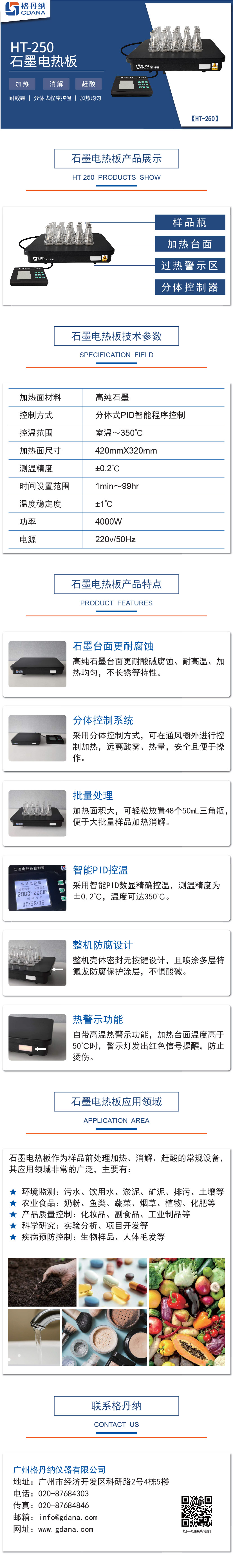 HT-250石墨加熱板(也稱為石墨電熱板)是元素分析樣品前處理實驗中進行加熱、消煮、趕酸的通用實驗儀器,格丹納石墨加熱板采用高純石墨材質加熱臺面,加熱均勻;同時可進行批量樣品消解處理,大大提高工作效率;PID分體式智能控制,實驗人員可遠離酸霧及熱量實驗安全可靠。