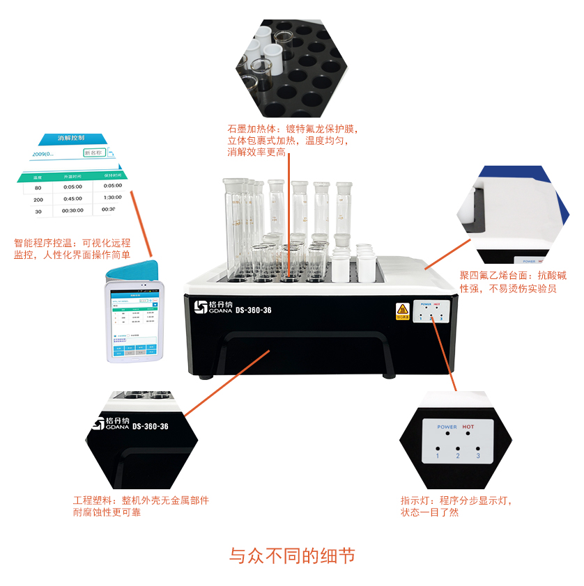石墨體表面噴涂特氟龍涂層,易清潔,耐腐蝕,整機(jī)外圍無(wú)金屬部件,可在強(qiáng)酸強(qiáng)堿等腐蝕環(huán)境中放心使用。36孔設(shè)計(jì),可批量消解,操作簡(jiǎn)單省時(shí)。