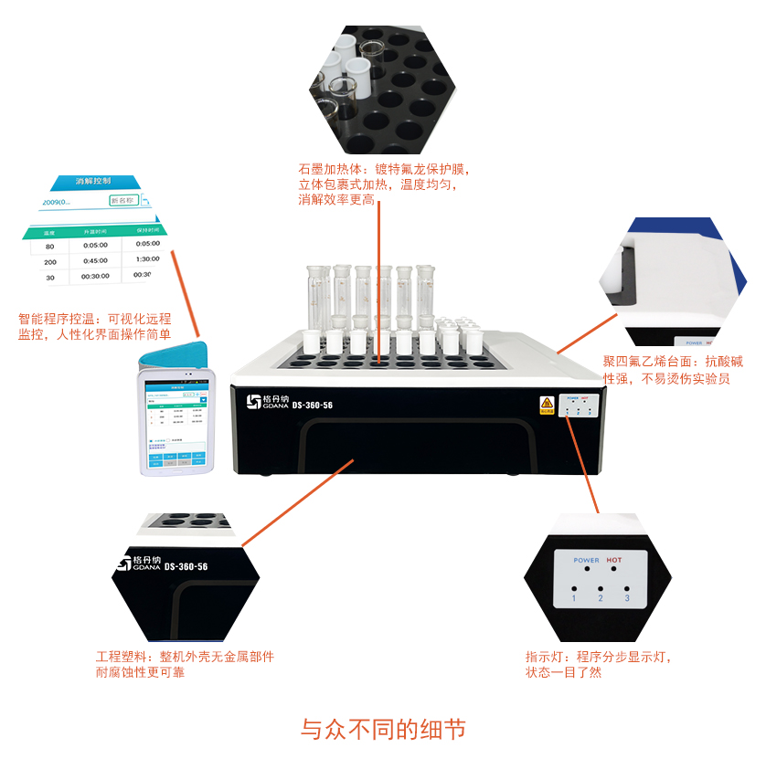 DS-360-56智能石墨消解儀具有56孔高通量設(shè)計(jì),可快速實(shí)現(xiàn)樣品批量處理,滿(mǎn)足樣品量大的消解用戶(hù);石墨材料作加熱體,孔間溫差±1.5℃,溫度均性好;無(wú)線控制,有效避免人員被酸霧及熱量傷害;設(shè)備操作簡(jiǎn)單,消解快速,是樣品元素分析時(shí)消解的好助手。