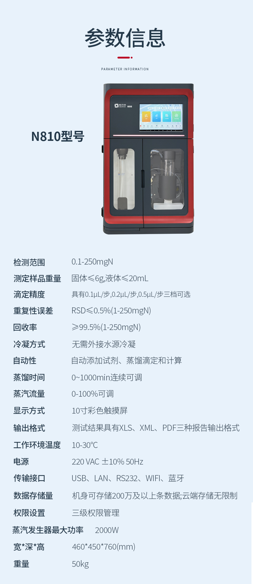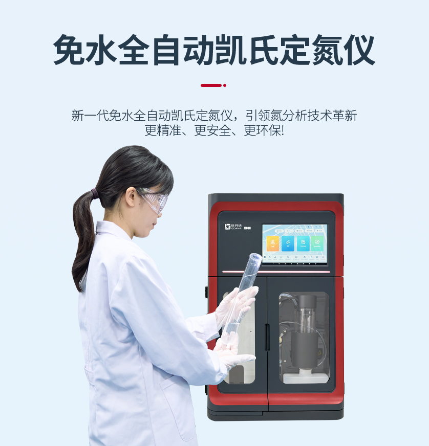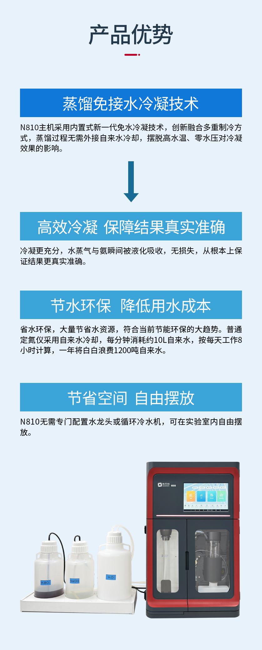 新一代N810免水全自動(dòng)凱氏定氮儀,突破了傳統(tǒng)凱氏定氮儀依賴外接水源或冷水機(jī)冷凝的局限,搭載免水冷卻系統(tǒng),既提升了實(shí)驗(yàn)的準(zhǔn)確度與效率,更增強(qiáng)了儀器運(yùn)行的可靠性。這一創(chuàng)新設(shè)計(jì),大幅節(jié)省了外接冷卻水循環(huán)機(jī)的采購成本與日常水資源開支。儀器集成免水冷凝、自動(dòng)加堿加酸、加注稀釋劑、蒸餾滴定、消化管排空、溶液液位監(jiān)測、超溫預(yù)警、清洗排廢、結(jié)果智能計(jì)算等全流程功能,實(shí)現(xiàn)凱氏定氮實(shí)驗(yàn)的無人值守式操作。儀器采用符合國家標(biāo)準(zhǔn)的凱氏定氮方法:濃硫酸環(huán)境消解樣品、堿性環(huán)境蒸汽蒸餾、硼酸吸收、加指示劑滴定、終點(diǎn)顏色判定法。