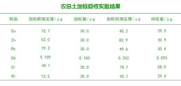 同時(shí)對農(nóng)田土進(jìn)行加標(biāo)實(shí)驗(yàn),平行加標(biāo)3份,加標(biāo)回收率進(jìn)行測定,結(jié)果如下表。