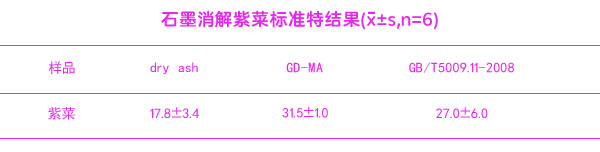 分別采用石墨消解灰化法(GD—MA)和GB/T5009.11—2003中總砷的干灰化法(dryash)處理樣品,測(cè)定紫菜(GBW10023)成分分析標(biāo)準(zhǔn)物質(zhì)中總砷含量,結(jié)果見表【石墨消解紫菜標(biāo)準(zhǔn)物結(jié)果】。