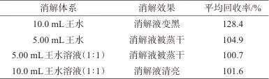 王水能夠破壞樣品中的礦物晶格,硝酸和鹽酸混合產(chǎn)生氯化亞硝酰作為混合物中的活化劑,能有效地氧化釋放試樣中的各元素,使目標(biāo)元素很好地進(jìn)入消解液中[15?16]??疾?組消解體系對加標(biāo)樣品的消解效果,分別為10.0 mL王水、5.00 mL王水、5.0 mL王水溶液(1∶1)、10.0 mL王水溶液(1∶1)。每組消解體系平行測定3次,利用加標(biāo)平均回收率考察4組消解體系的消解效果,結(jié)果見表2。由表2可知,以10.0 mL王水溶液(1∶1)為消解體系時,消解液清亮,平均回收率為101.6%,消解效果良好。綜合考慮消解過程中樣品的消解狀態(tài)及效果、分析檢測過程對酸度和用量的要求,消解體系選擇10.0 mL王水溶液(1∶1)。