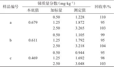 選取3種糖廠濾泥樣品,編號分別為a、b和c,分別加入低、中和高3個濃度水平的銻標(biāo)準(zhǔn)溶液,按1.4方法進(jìn)行樣品處理,按照1.5方法分別測定,結(jié)果見表5。由表5可知,樣品加標(biāo)回收率為95%~110%,表明該方法具有較高的準(zhǔn)確度。
